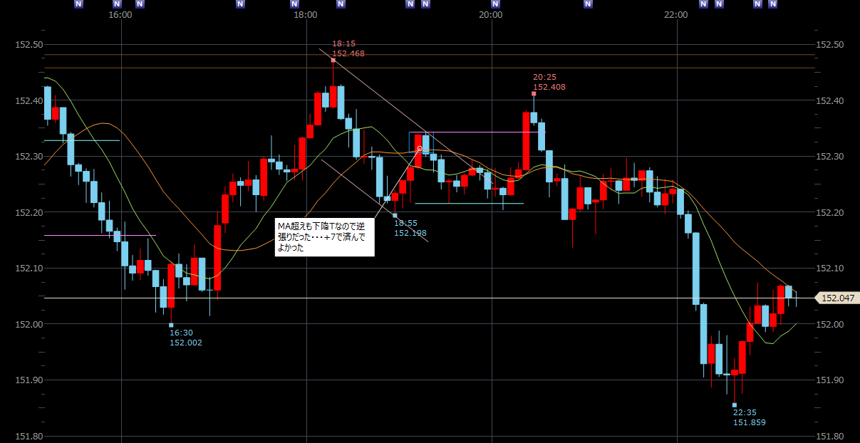 16:00以降注視したがエントリーポイントが見つからず。高値を切り上げた直後に下がって安値を切り下げるかんじで方向がわからない。一度入ったがすぐ撤退。その後もプライスアクションから読むこともできない動きをしていたので静観。