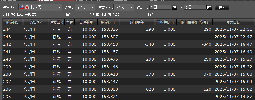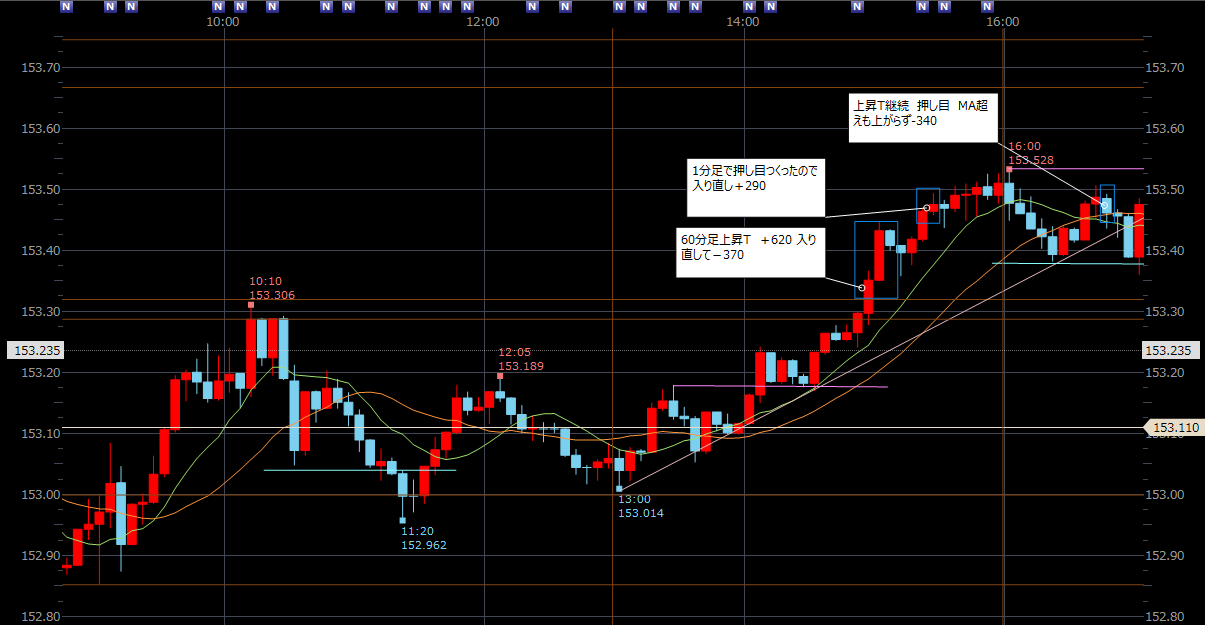 利確した後もトレンドが継続していれば、AOで勢いを見ながら1分足の押し目で入り直せばいい。戦術としては間違っていない。