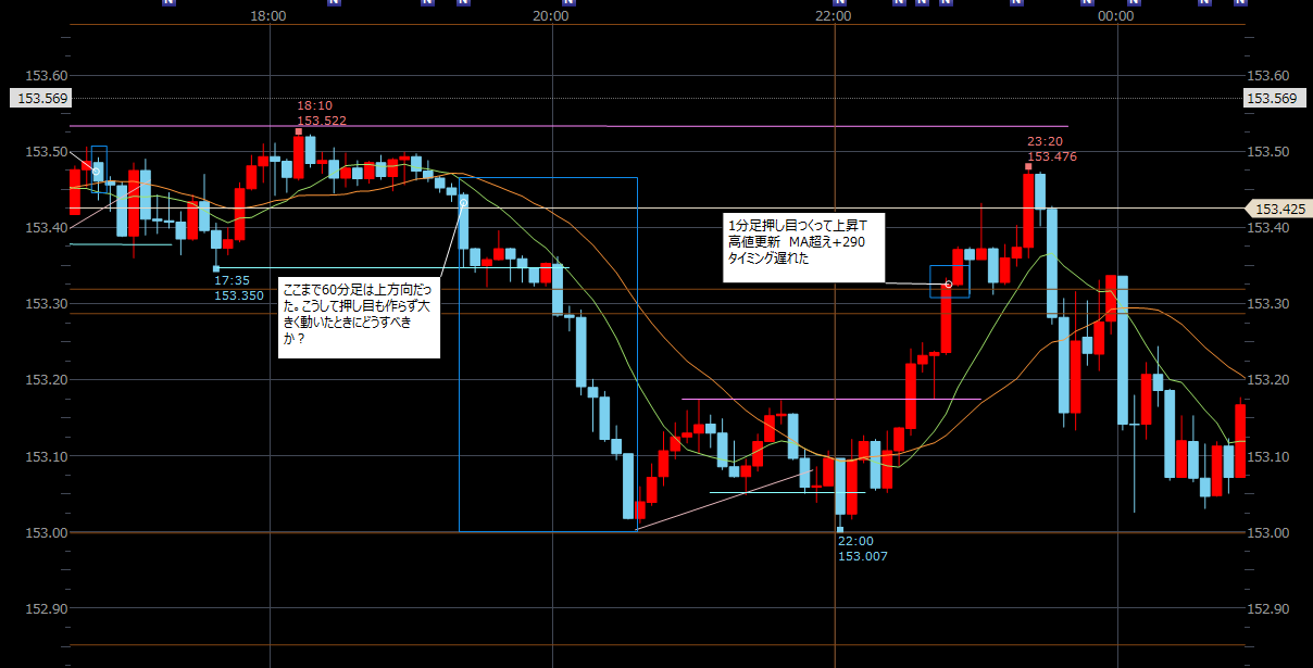 判断が難しいのは60分足と下位足の足並みが揃わないまま大きく動いたとき。ダウ理論でトレンドが出ておらず、MAが逆もしくはレンジの場合はどうすべきか?