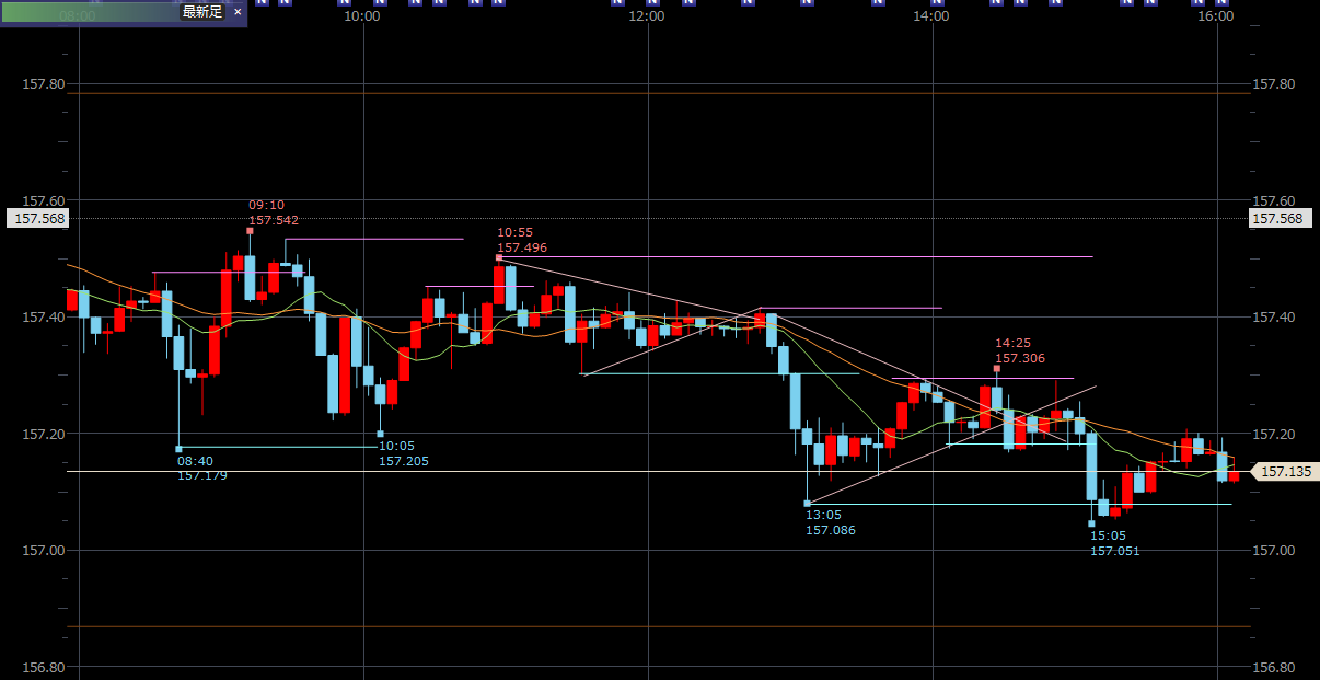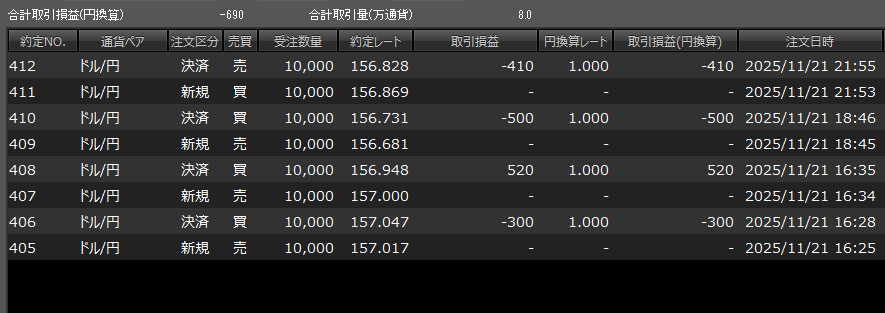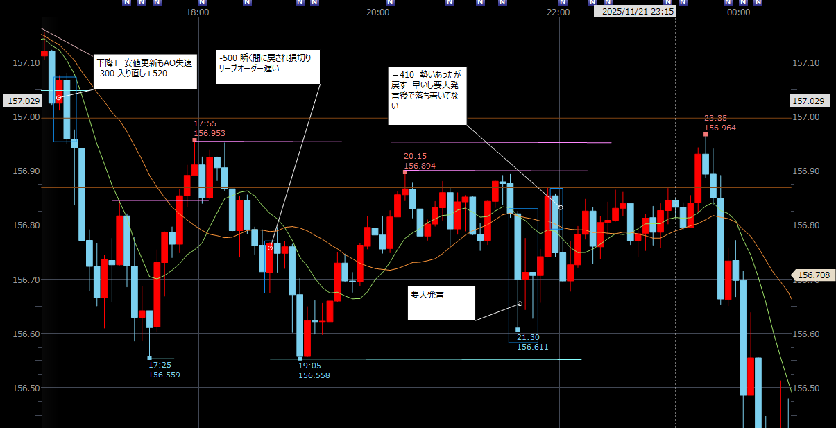 スポンサーリンク 【FXノート】2025年11月21日 デイトレノート 2025.11.24 スポンサーリンク 東京時間 15分足は下降トレンド継続。5分足もラインが引けたが値幅が狭くエントリーポイントが見つからず。 欧州・米国時間 トレード収支 今日の収支 -690円 2025年11月の収支 -2,680円 生涯損益(2025年10月~)-3,345円 【FXノート】2025年11月20日 【FXノート】2025年11月24日 コメント ホームデイトレノート スポンサーリンク スポンサーリンク
