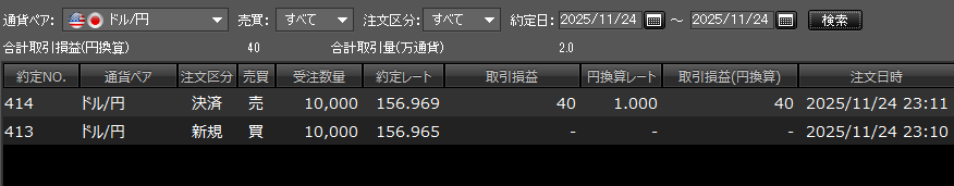 スポンサーリンク 【FXノート】2025年11月24日 デイトレノート 2025.11.242025.11.25 スポンサーリンク 東京時間 東京市場は休場 欧州・米国時間 16:00以降は狭いレンジ。22時を過ぎて動いたが、上値が重く体調も整わないので早々に手じまい トレード収支 今日の収支 +40円 2025年11月の収支 -2,640円 生涯損益(2025年10月~)-3,305円 【FXノート】2025年11月21日 【FXノート】2025年11月25日 コメント ホームデイトレノート スポンサーリンク スポンサーリンク