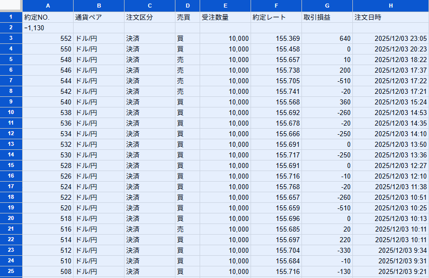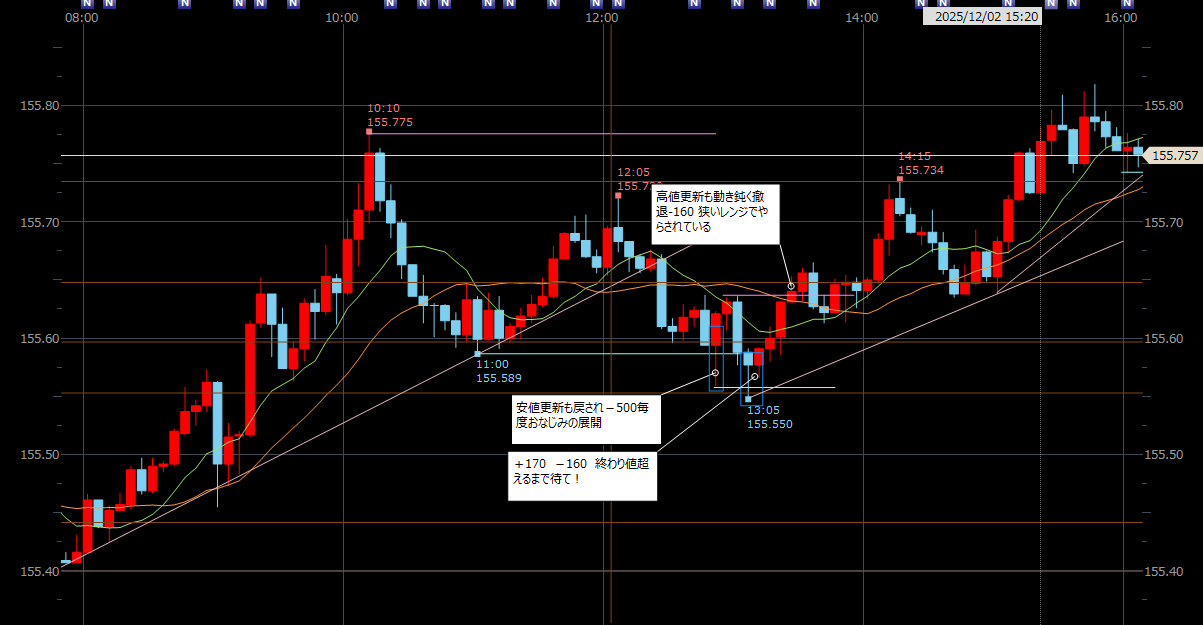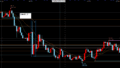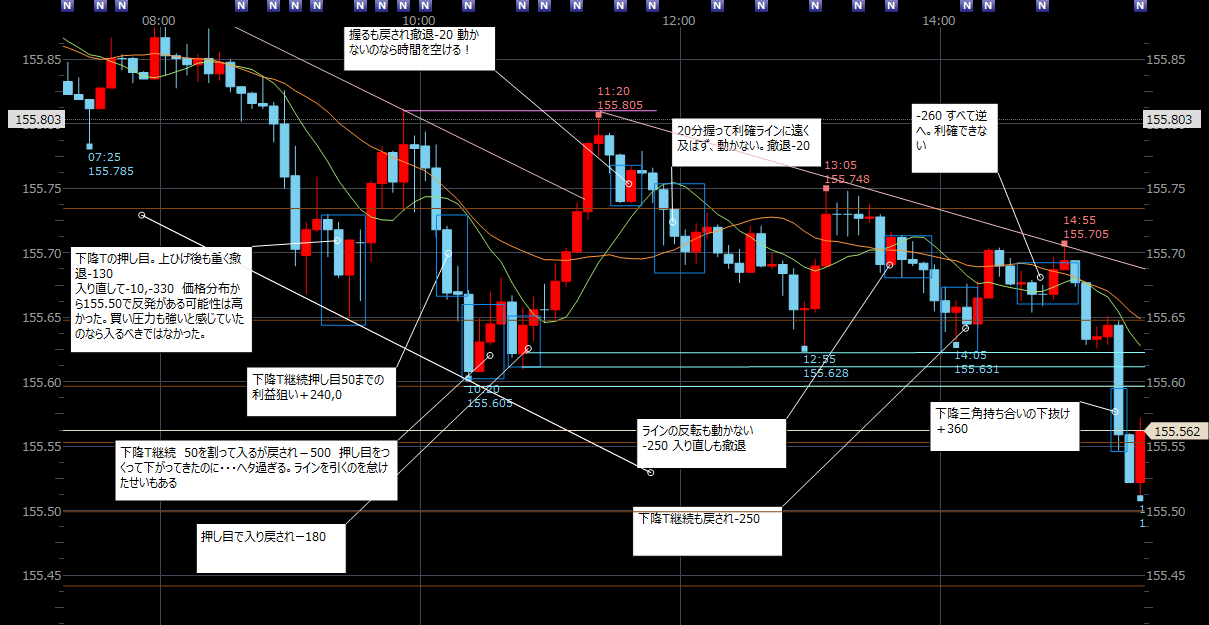 上位足・下位足ともに下向き。ラインも引けたので売り一本で押し目を探って入るが、ことごとく失敗。プラスに動いても利確ラインに届く前に失速&撤退。入った瞬間に戻されて損切り。この繰り返し。動きも鈍いのでジワジワと損失が拡大していく。入ってみて動きがないと感じたときは欧州時間まで待つなど、切り替えを行うこと。