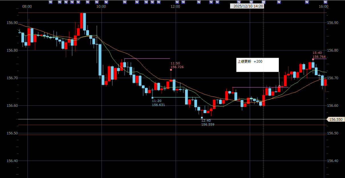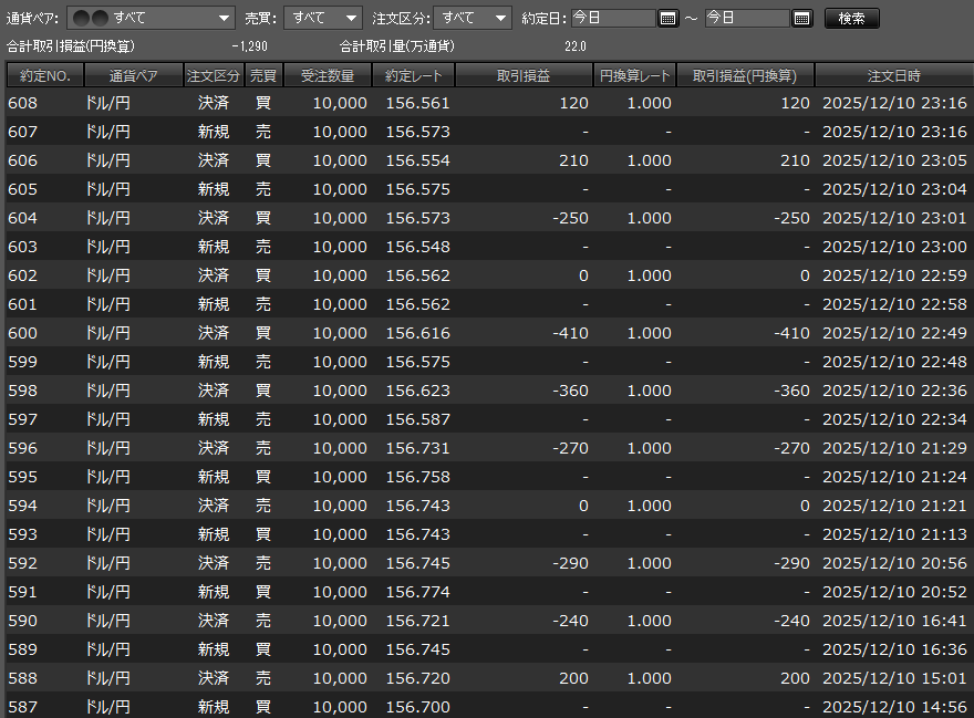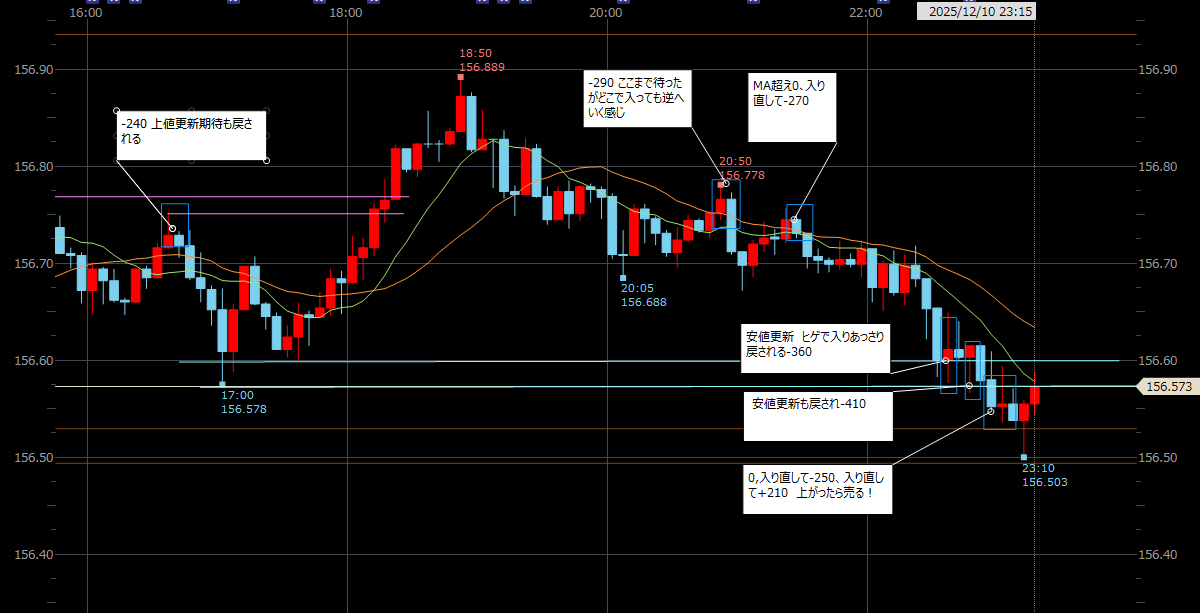 【FXノート】2025年12月10日 デイトレノート 2025.12.10 東京時間 欧州・米国時間 上位足が上昇Tなので買いで入るが逆へ。22時過ぎから下降Tで売りも逆。こういうMAに張り付くようなチャートのときは上がったら売ってすぐ利確!最後の2つを忘れずに。 トレード収支 今日の収支 -1,290円 2025年12月の収支 ー2,200円 生涯損益(2025年10月~)-5,034円 【FXノート】2025年12月4日 コメント ホームデイトレノート