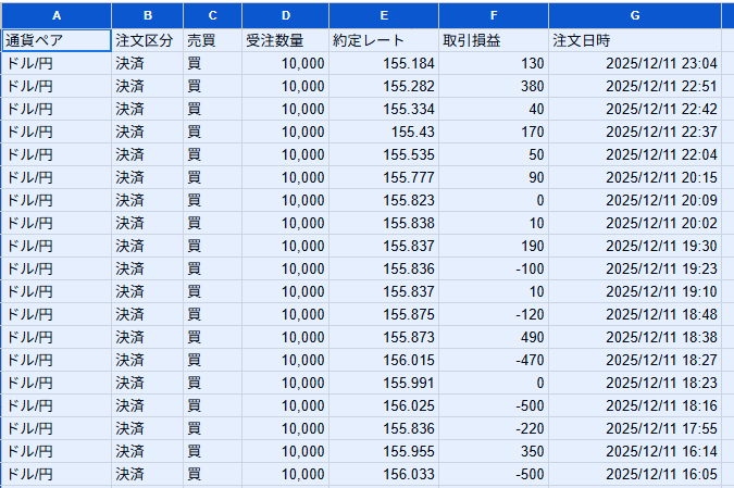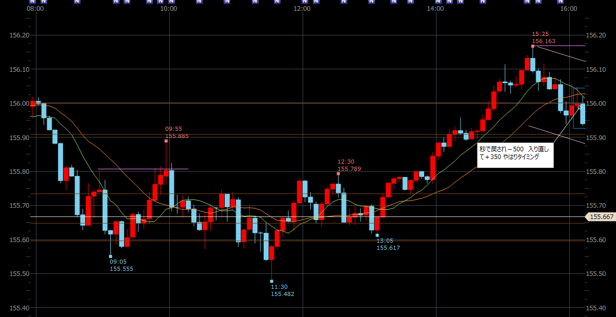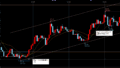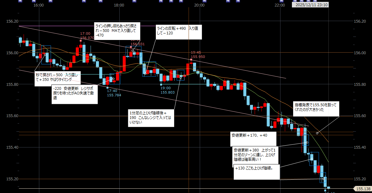下降トレンド継続でトレンドラインも引けたがヨコヨコの時間が長く、利確のチャンスも短くて難しかった。下降トレンドでMAが追従しているときは1分足が上がり、ゾーンに達してから上ひげ陰線が出たら売り。これはかなり確率が高い。1,500円以上のマイナスを取り戻せたのは大きい。