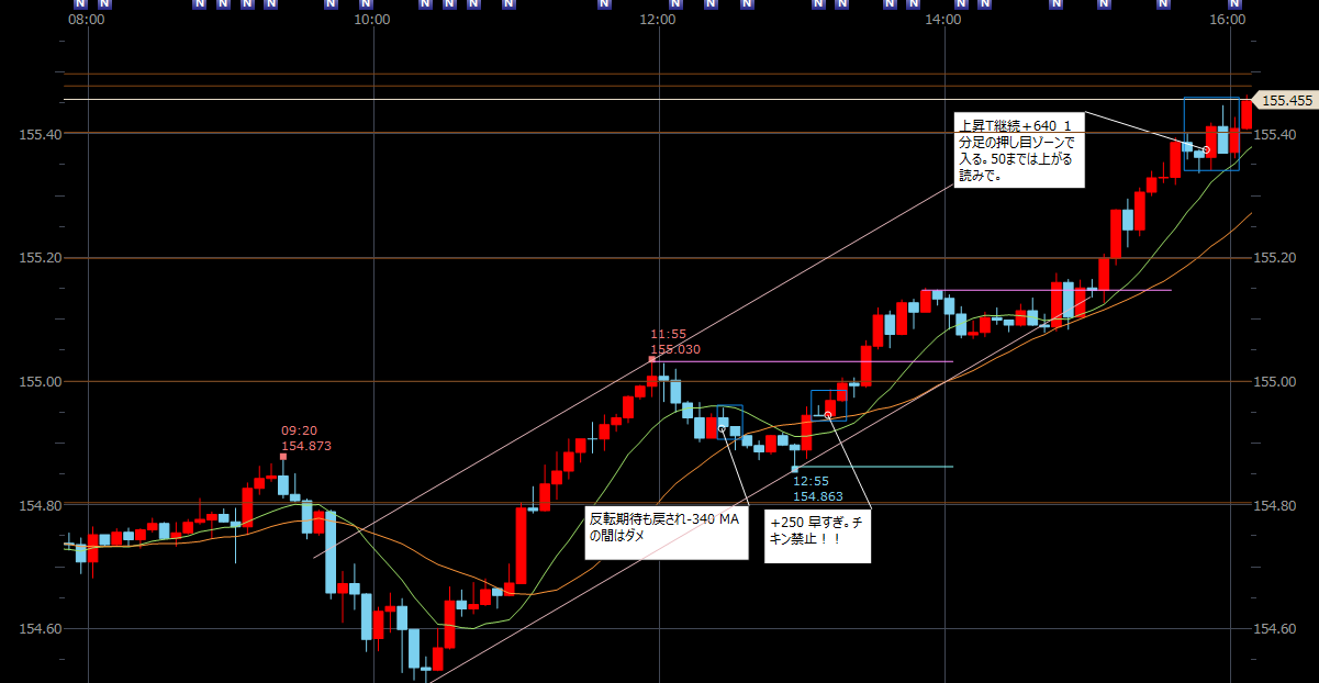 10:00以降は上昇トレンド継続。あいかわらずのチキン利確で利益が伸びない。価格分布も確認しておきながら、節目を怖れて利確している。