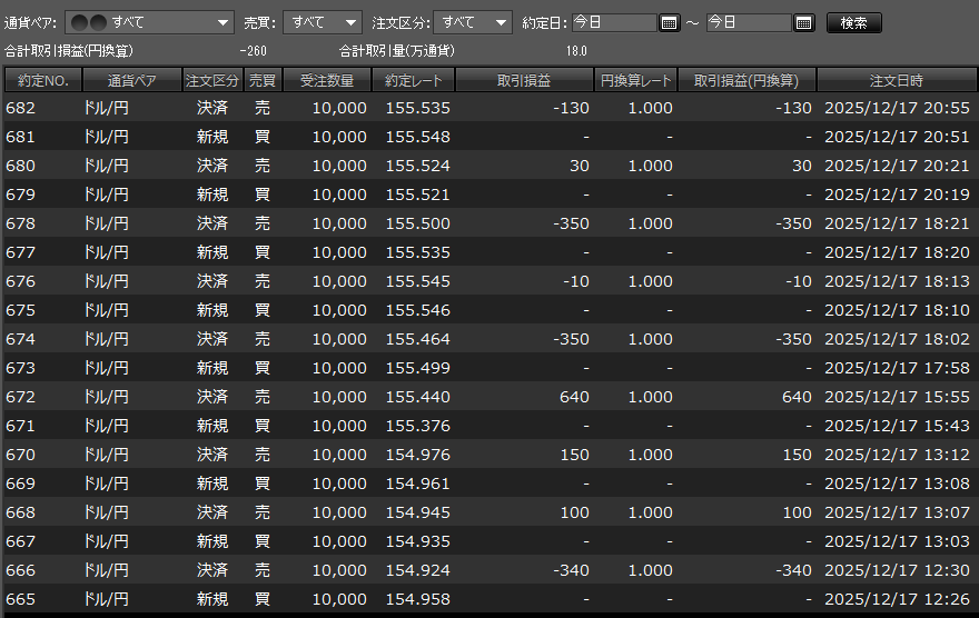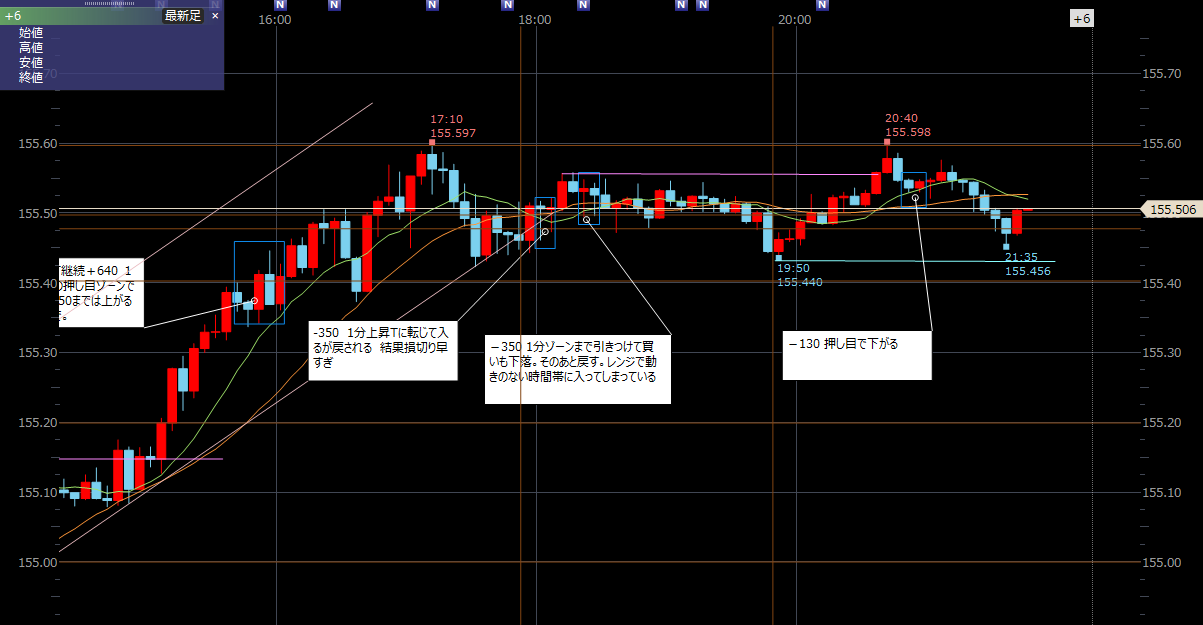 17時以降は下げた後、膠着状態に。そうなっていることに気づかずちいさな利益を狙いにいって連敗。マイナスに転じる。