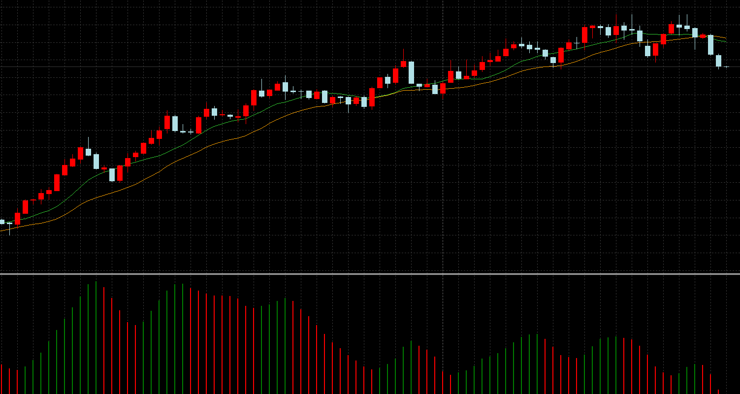 1分足。上昇の角度は変わらないが、AOを見ると違いは歴然で、後半は上も下も勢いをなくしている。事実、このあと下げていったので狙うならやはり波の大きなところ。ここが初動期なのだろう。