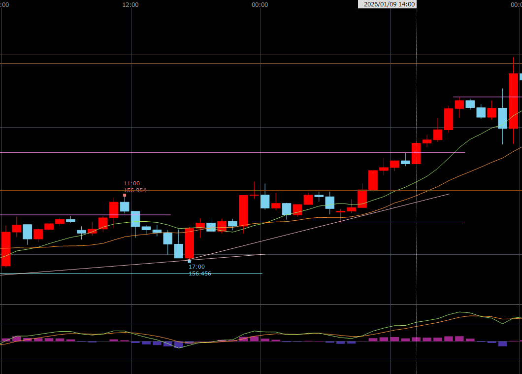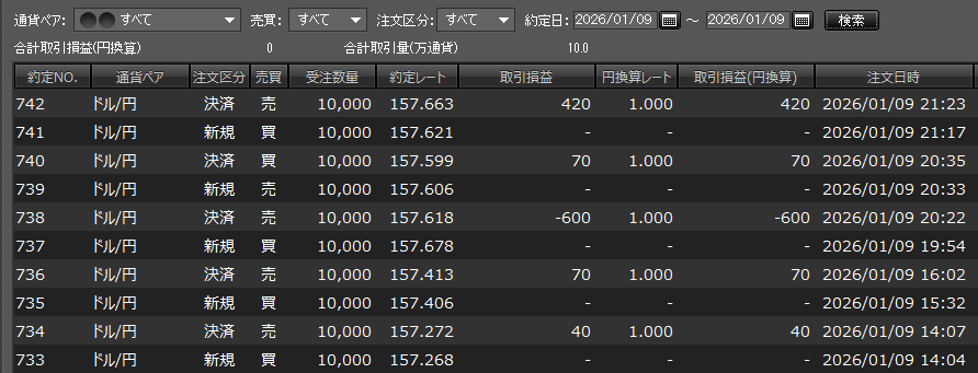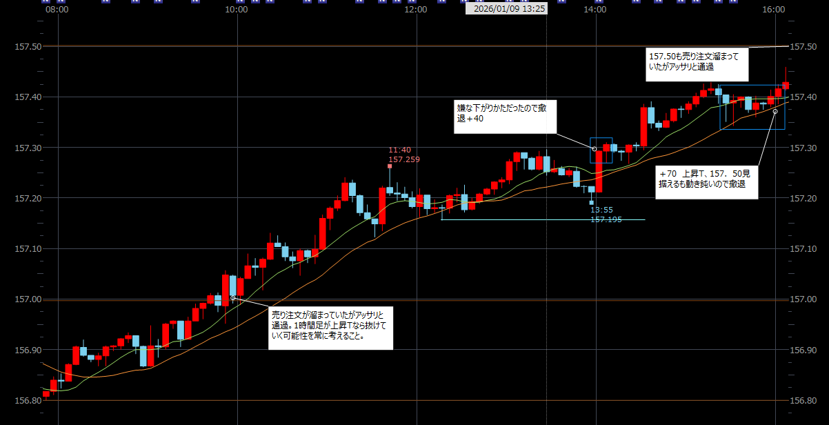 【FXノート】2026年1月9日 デイトレノート1時間足 2026.01.12 1時間足 東京時間 仕事優先なので仕方ないが…5,000~7,000は穫れた相場。こんな日にデイトレをやるために学んでいる。 欧州・米国時間 トレード収支 今日の収支 0円 2026年1月の収支 +90円 2026年の収支 +90円 生涯損益(2025年10月~)-7,764円 【FXノート】2026年1月8日 【FXノート】2026年1月12日 コメント ホームデイトレノート