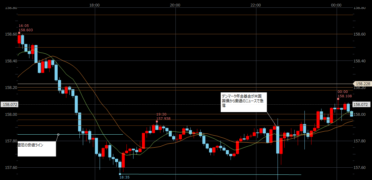 午前中はナーバスな動きをしていたので警戒しつつ。午後は仕事をしながらだったので、反転の初動、高値ブレイクとも乗り遅れ。利確できたのは幸運だった。