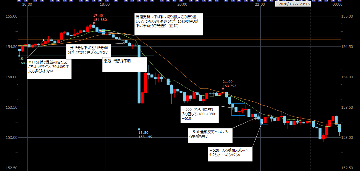 謎の急落以降は下げで足並み揃っていたが…入るところが悪い上によく動くのであっという間の損切りを連発。入った瞬間にスプレッドが4.2になる場面もありで…。