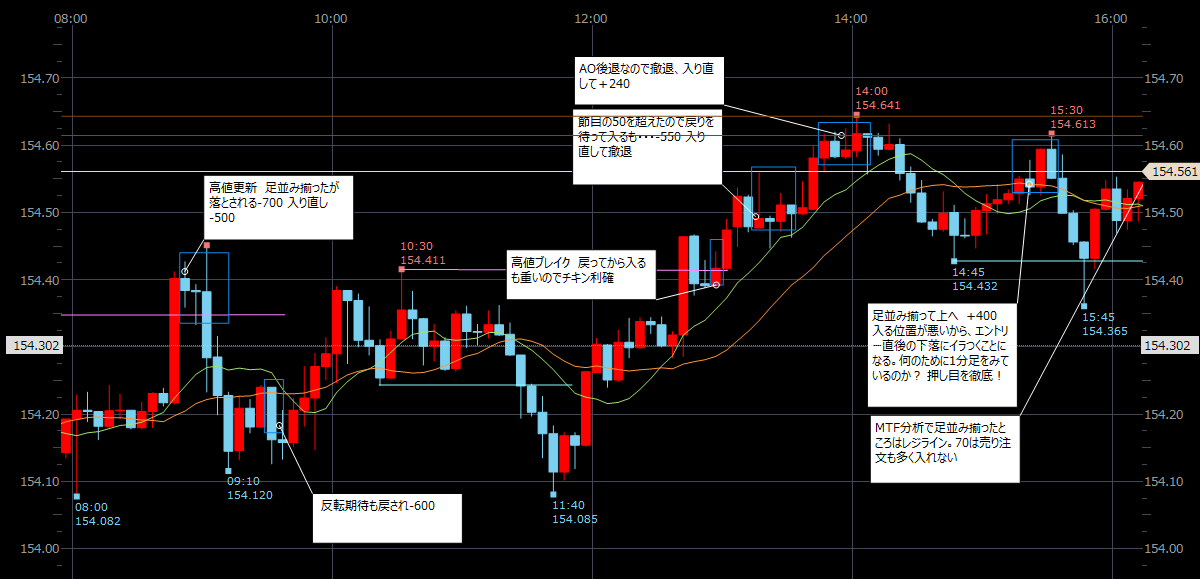 早い時間に2,000円ちかくやられたので…トレンドは出ていないが傍観できないので小さく取り戻しにいく。こういう相場ほど、押し目買いの徹底を。上がったところで入るから下降にイラつくことになる。この差は大きい。