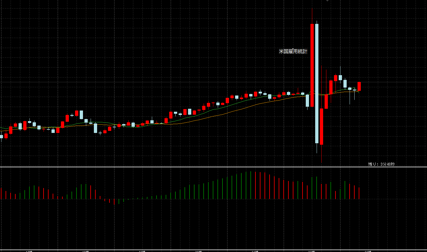18時から下位足は上昇に転じたが、1時間足が下向きなので静観。いつもの課題。米国雇用統計はすさまじい値動き。生き残りたいので入らない。
