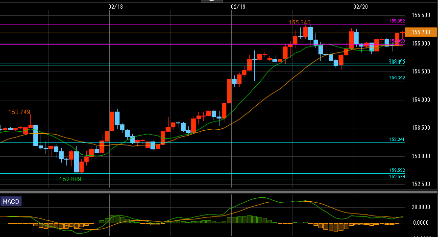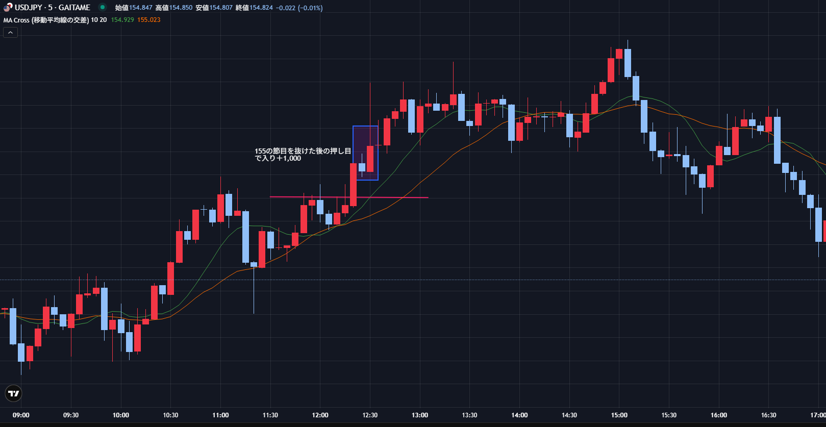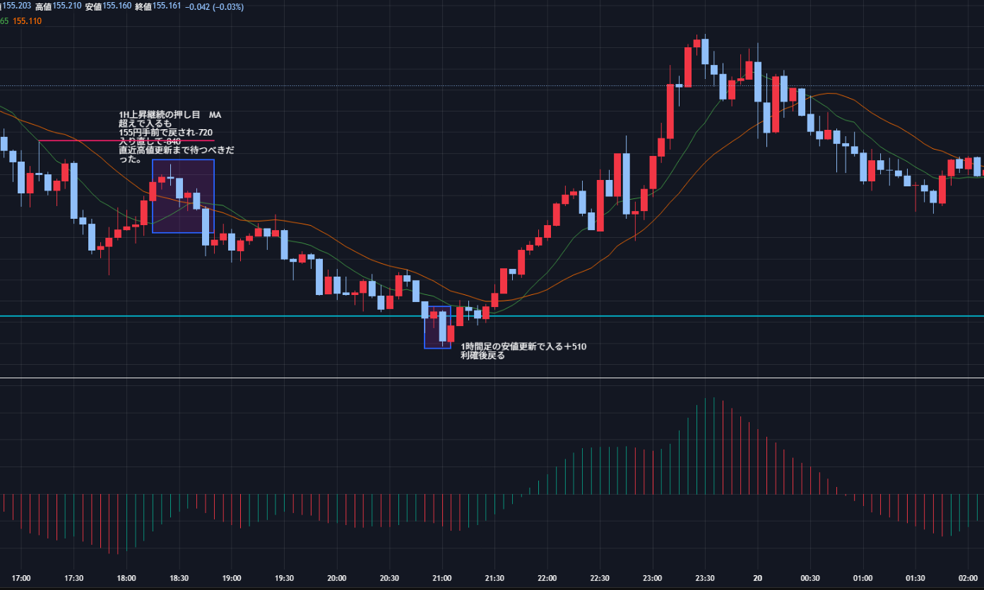 1時間足は上昇T継続。高値更新&155円の節目を超えたところで入って+1,000