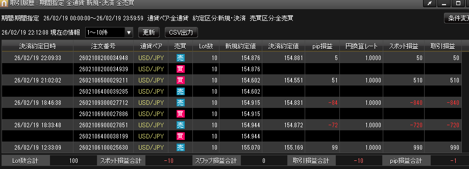 15時台から5分、15分は下向き。1時間足は上昇T継続だったので18時台の押し目で入るが戻され連続損切り。155の節目と直近高値更新を待つべきだった。21時またぎは1H足の安値更新。戻りを待って入り利確。安値・高値更新のときはAOの向きが反対でもOK。AOは勢いを見るためのツールなので方向は総合的に判断すること。