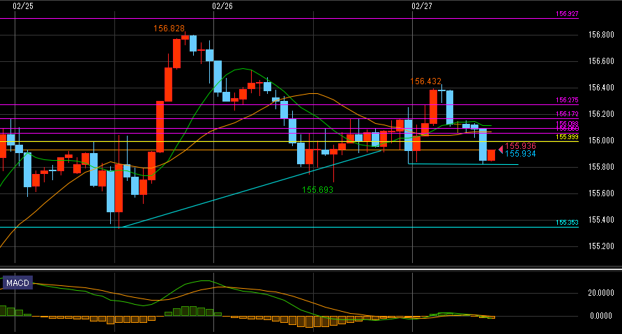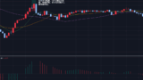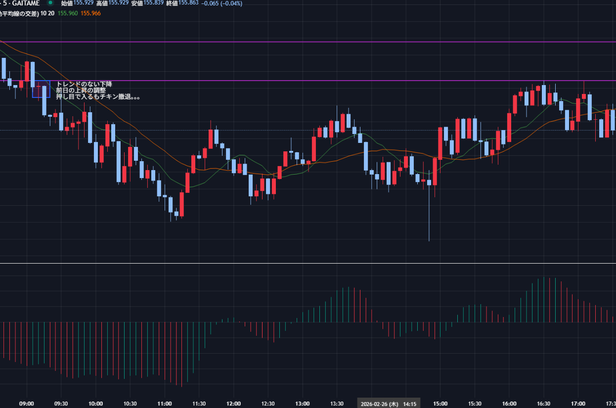 昨日の上昇に対する調整的な下降後、40銭程度の値幅でもみ合いが続く。1時間足はダラダラ下げていったが、上昇トレンドのなかの下げ。