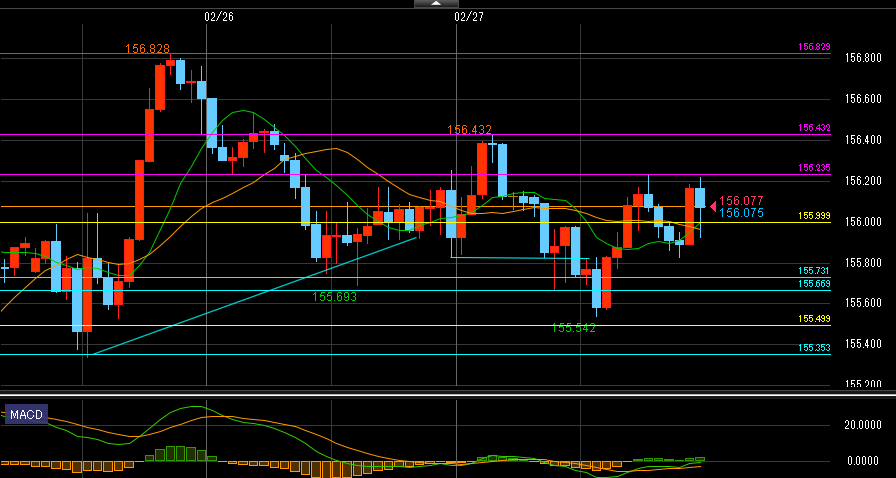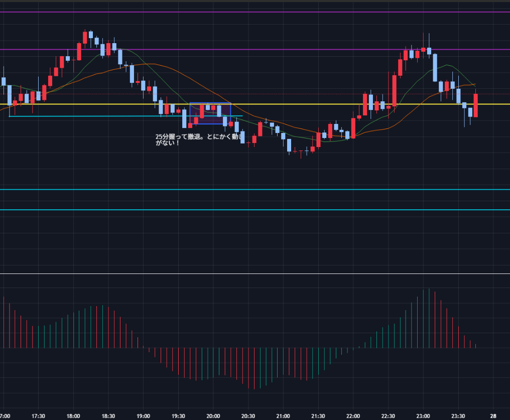 17:30以降も上昇も1H足はトレンド転換に至らず。反転下降しても156円で止まる。動き鈍すぎてどうしようもない。