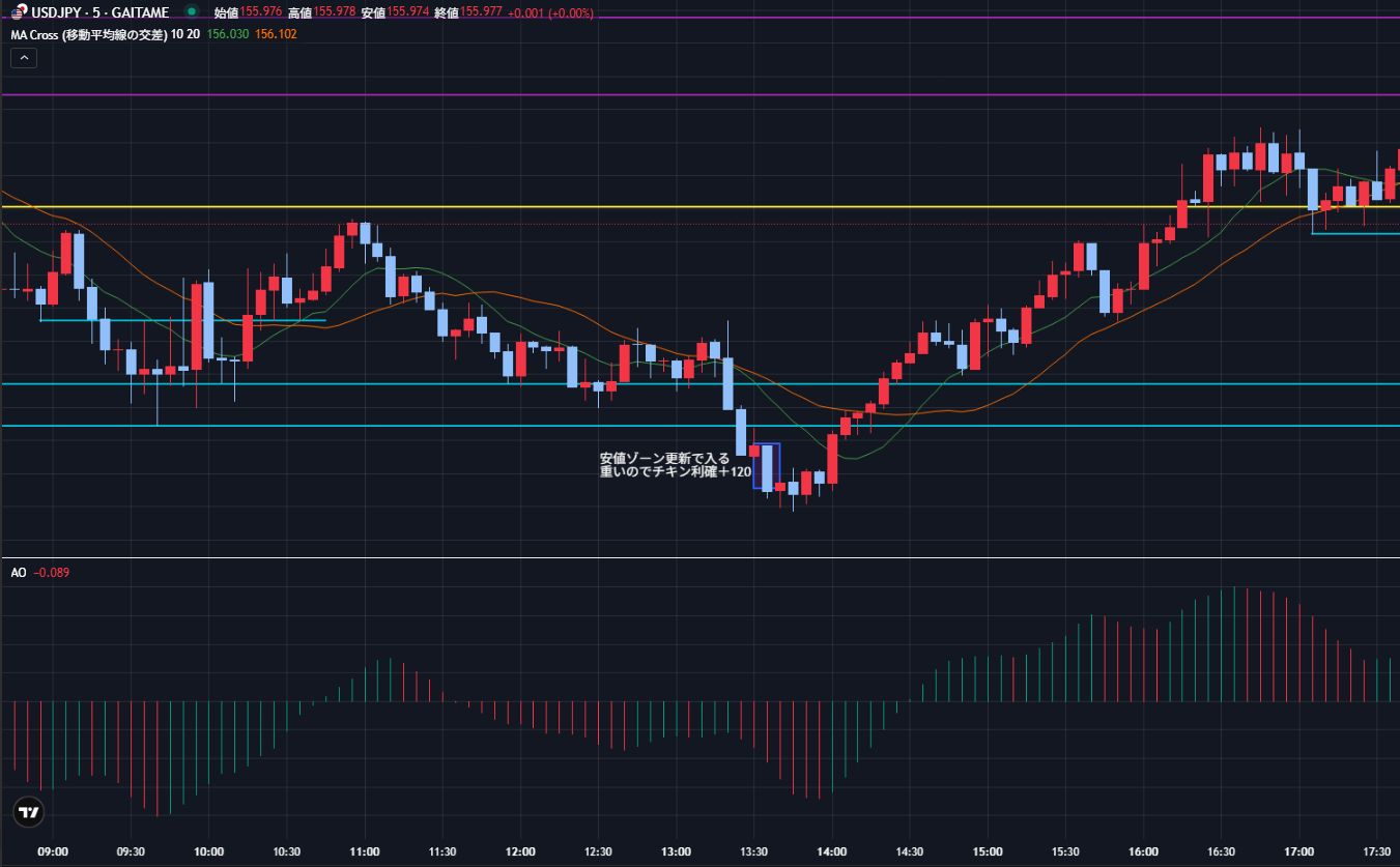 安値ゾーン更新も下げ渋って反転。1時間足が下降なので入らず。動き鈍い。156円で止まる。