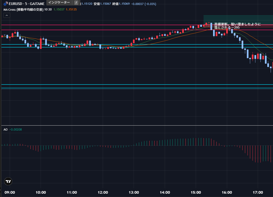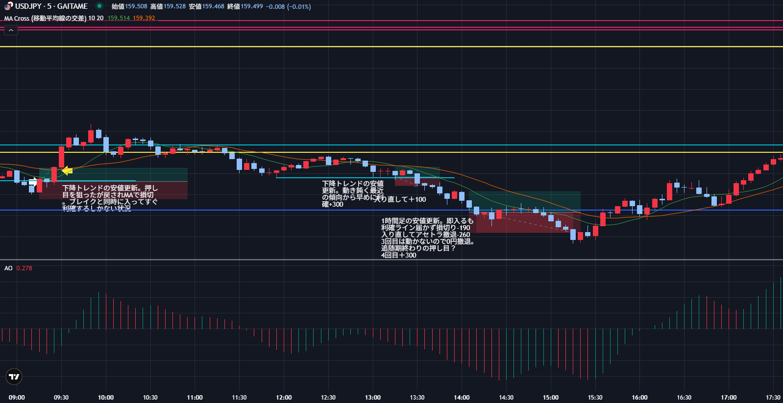 USD/JPYは下降トレンドを活かせず。反転後はいつものごとく上位足下降T継続→下位足上昇T転換の図式になってエントリーできず。