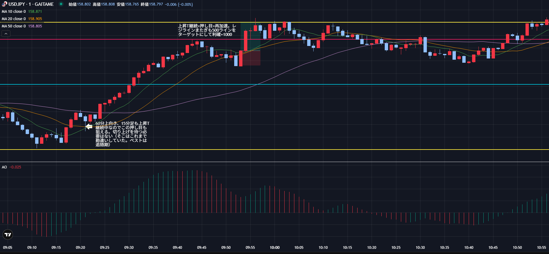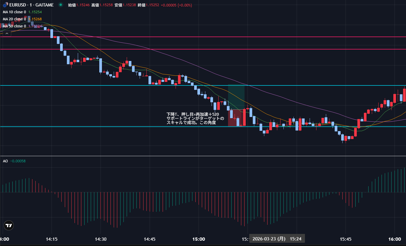 15分トレンド×5分の押し目待ち×1分の再加速初動でしっかり利確できた。チャートの角度、ローソク足の長さ(勢い)、レジライン&サポートラインにも注目してトレードできた。