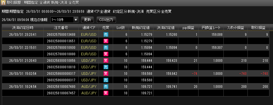 【FXノート】2026年3月31日 デイトレノートAUD/JPY1分足 2026.04.01 東京時間 AUD/JPY USD/JPY 米国時間 USD/JPY トレード収支 今日の収支 -321円 2026年3月の収支 -8,364円 2026年の収支 ー9,934円 生涯損益(2025年10月~)-17,818円