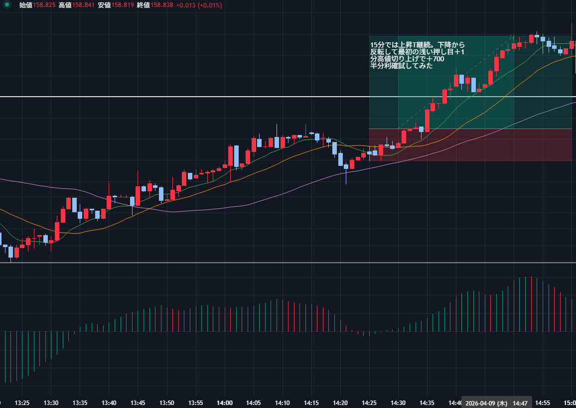 【FXノート】2026年4月9日 デイトレノートEURUSD 2026.04.10 東京時間 USD/JPY5分 USD/JPY1分 USD/JPY1分 初動、追随、利確期の見極めが必要。 米国時間 エントリーなし トレード収支 今日の収支 +5円 2026年4月の収支 -1,473円 2026年の収支 ー11,048円 生涯損益(2025年10月~)-19,301円