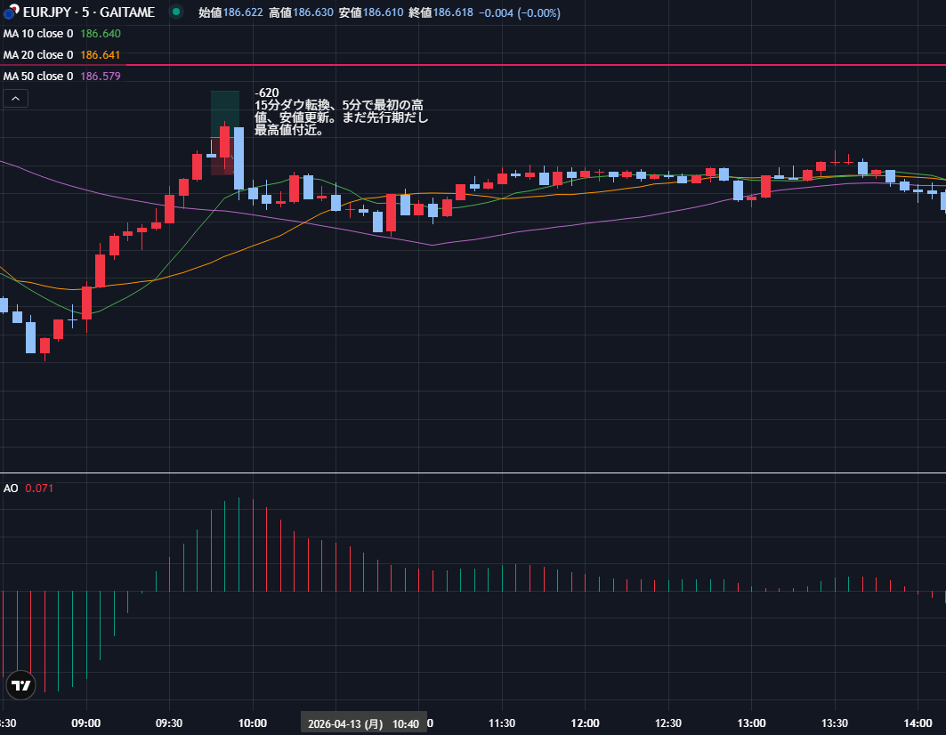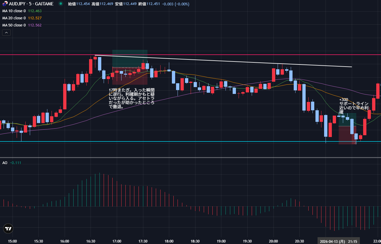 【FXノート】2026年4月13日 デイトレノートEUR/JPY 2026.04.14 東京時間 EUR/JPY 先行、追随、利確期の見極めができていない。 米国時間 AUD/JPY 中東情勢の成り行きを見守る相場が続く。トレンドが出て伸びていく期待は持てない。 トレード収支 今日の収支 -340円 2026年4月の収支 -1,804円 2026年の収支 ー11,388円 生涯損益(2025年10月~)-19,641円