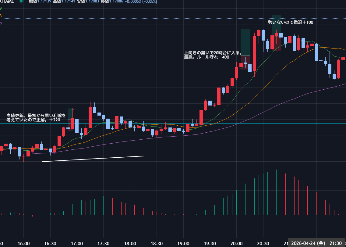 トレンドが出てトレードできる状況になったので欧州時間に入る。ルールを守れ。状況が整うのを待て。
